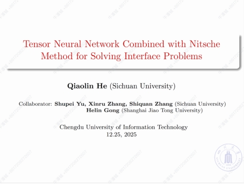 本次报告聚焦复杂界面偏微分方程的高效求解,系统介绍了张量神经网络与 Nitsche 方法相结合的创新计算框架。报告指出,传统数值方法和标准物理信息神经网络在界面条件处理上存在精度与约束施加困难的问题。为此,贺巧琳利用张量分解提升网络表达能力与计算效率,并通过Nitsche方法将界面条件以弱形式嵌入损失函数,实现对界面不连续行为的准确刻画。该方法适用于多子区域和系数跳跃等复杂界面问题,显著提升了求解精度与稳定性。报告还展示了其在两群中子扩散特征值问题中的应用,数值结果验证了方法的有效性。报告内容引发了师生对智能计算与数值分析交叉研究的深入讨论,为相关研究提供了新的思路。