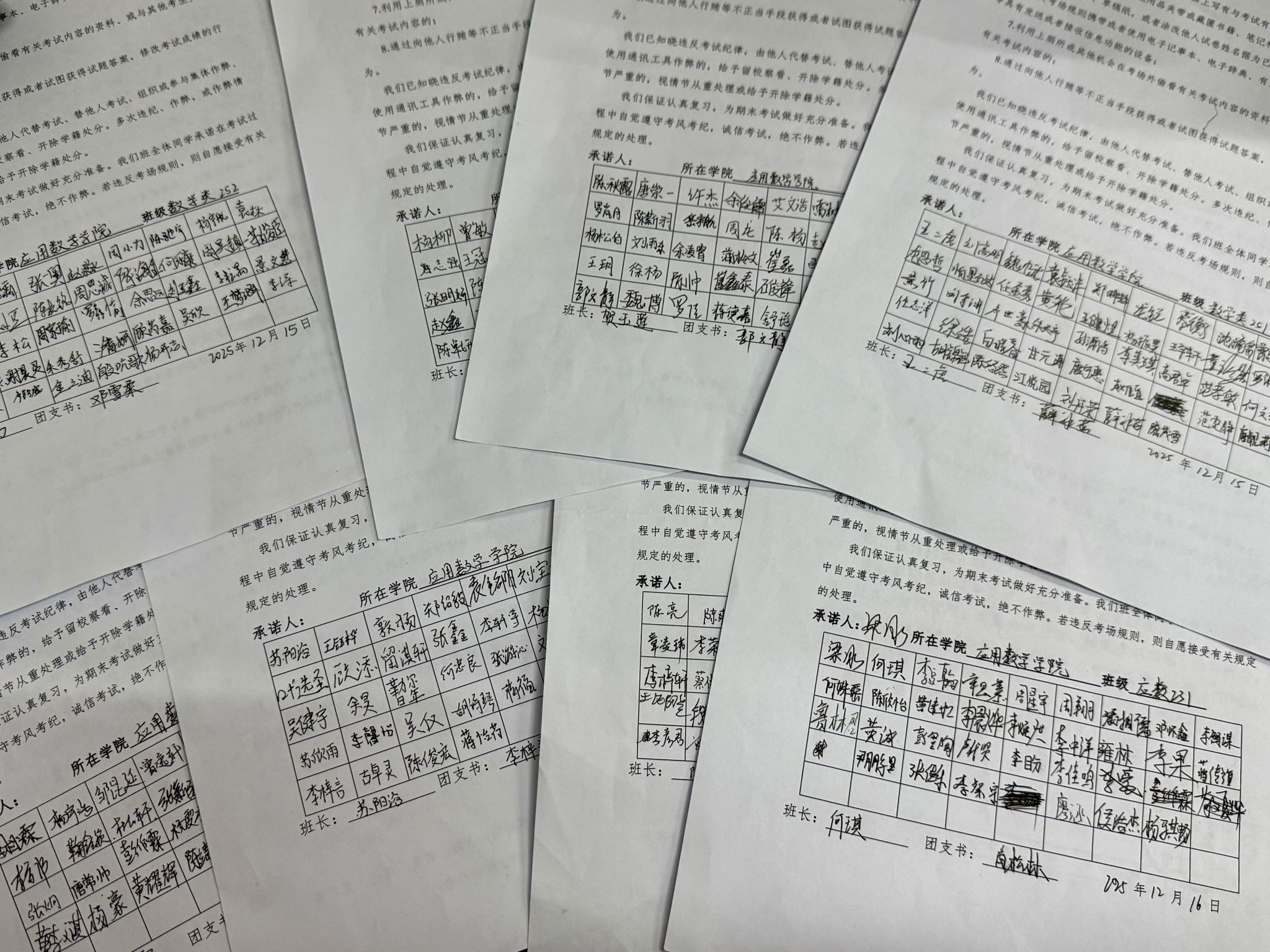 考风是学风的重要体现,也是育人成效的关键检验。学院党委高度重视,党政领导齐抓共管,各年级辅导员深入班级,组织召开诚信考试主题班会,结合相关规章制度与典型案例,详细解读考试纪律要求,明晰违纪后果,引导学生树立正确的考试观、成绩观。主题班会后,辅导员组织各班学生签署《诚信考试承诺书》,学生们郑重承诺将自觉遵守考场纪律,以真实学识和努力接受检验。